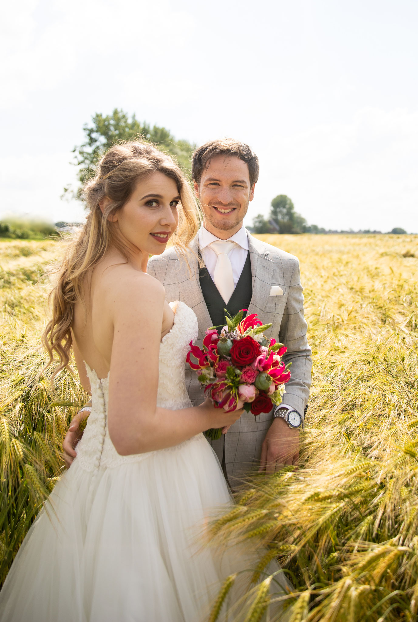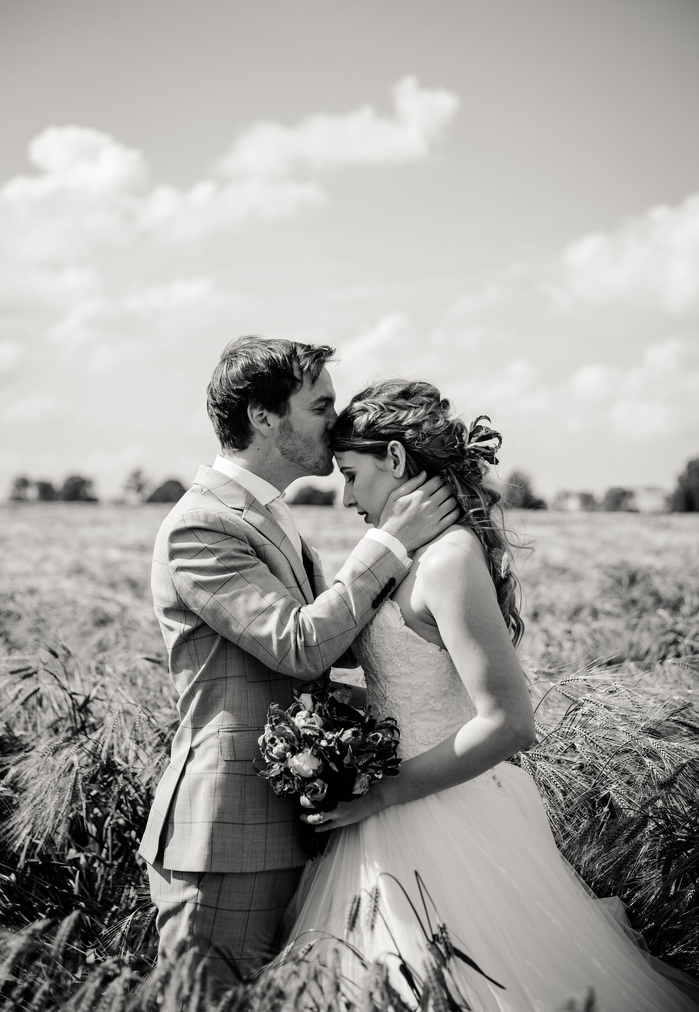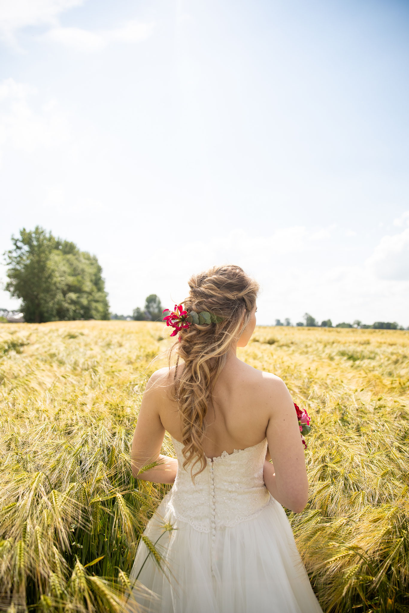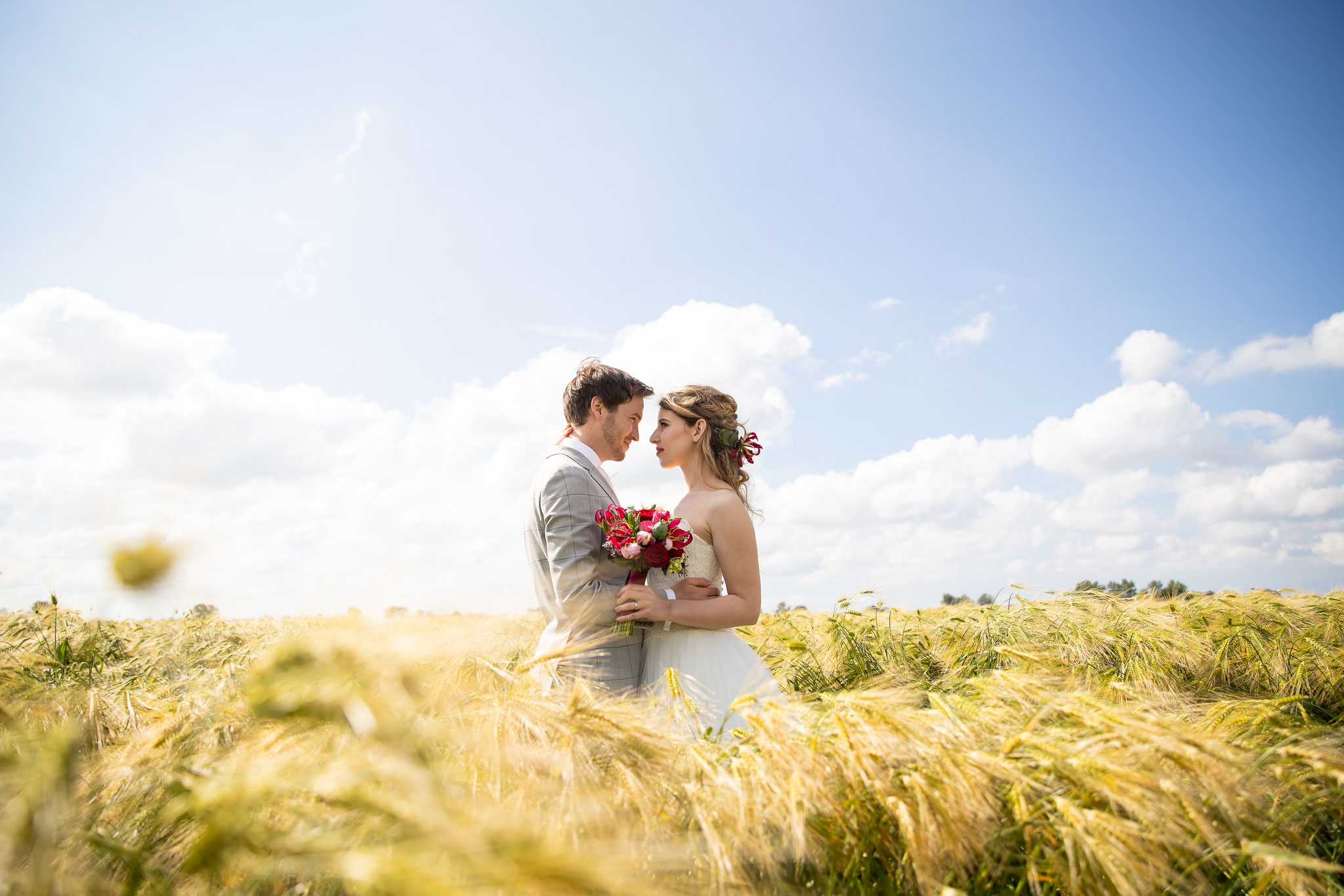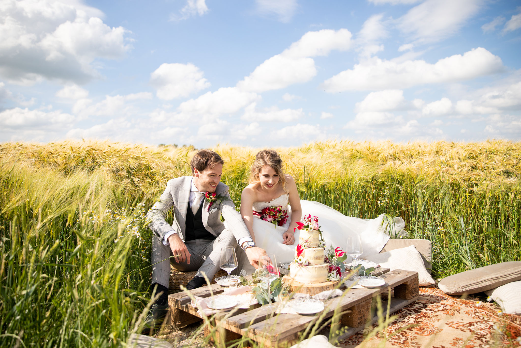 Uitgerekte velden vol graan en een onstuimige lucht dienden als achtergrond voor deze prachtige gestileerde bruiloftsshoot. In de namiddag bewees het zonlicht perfect voor een romantisch plaatje. Het resultaat? Een ontspannen fotoserie met de kracht van de pure natuur en de liefde tussen Robin en Meddy.