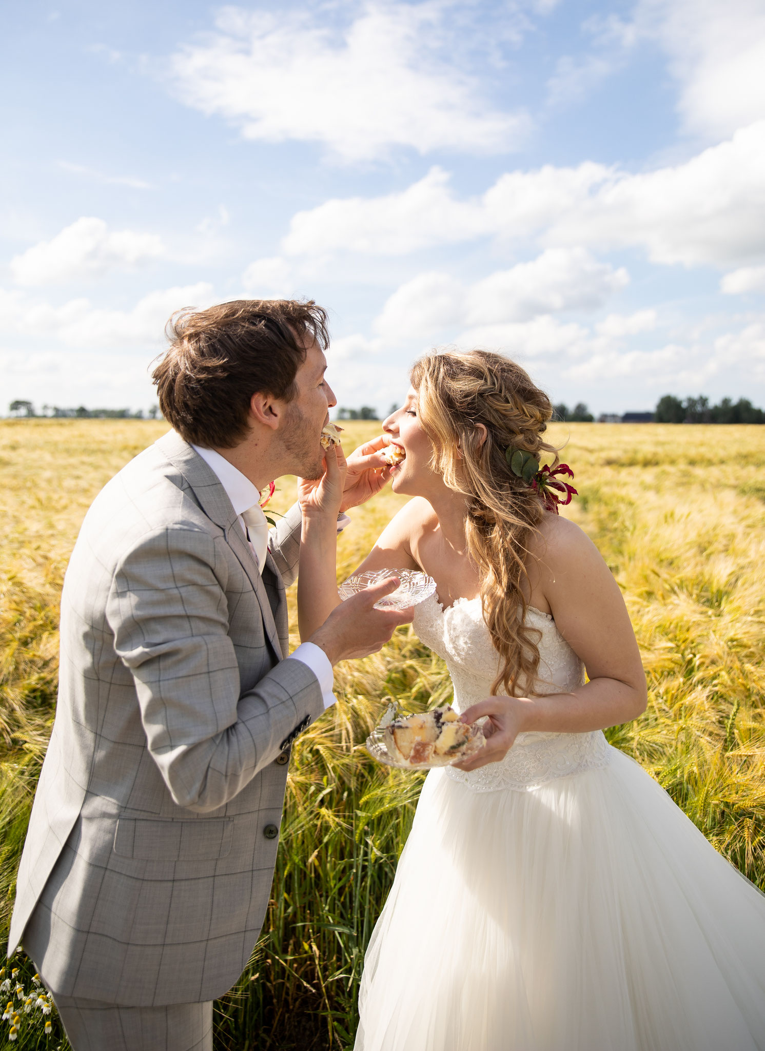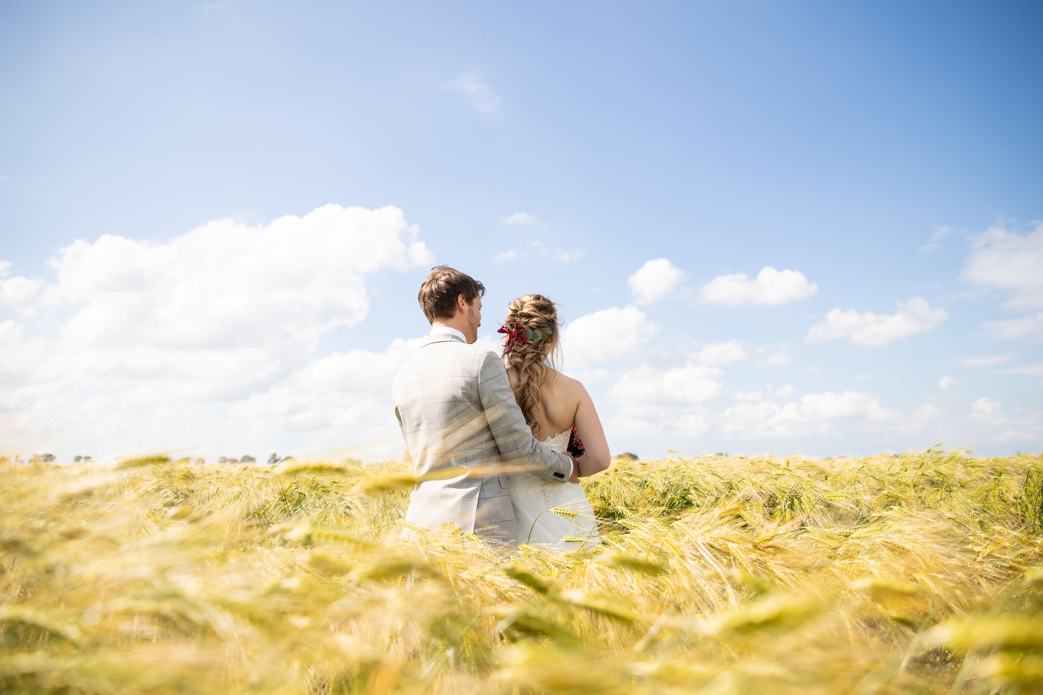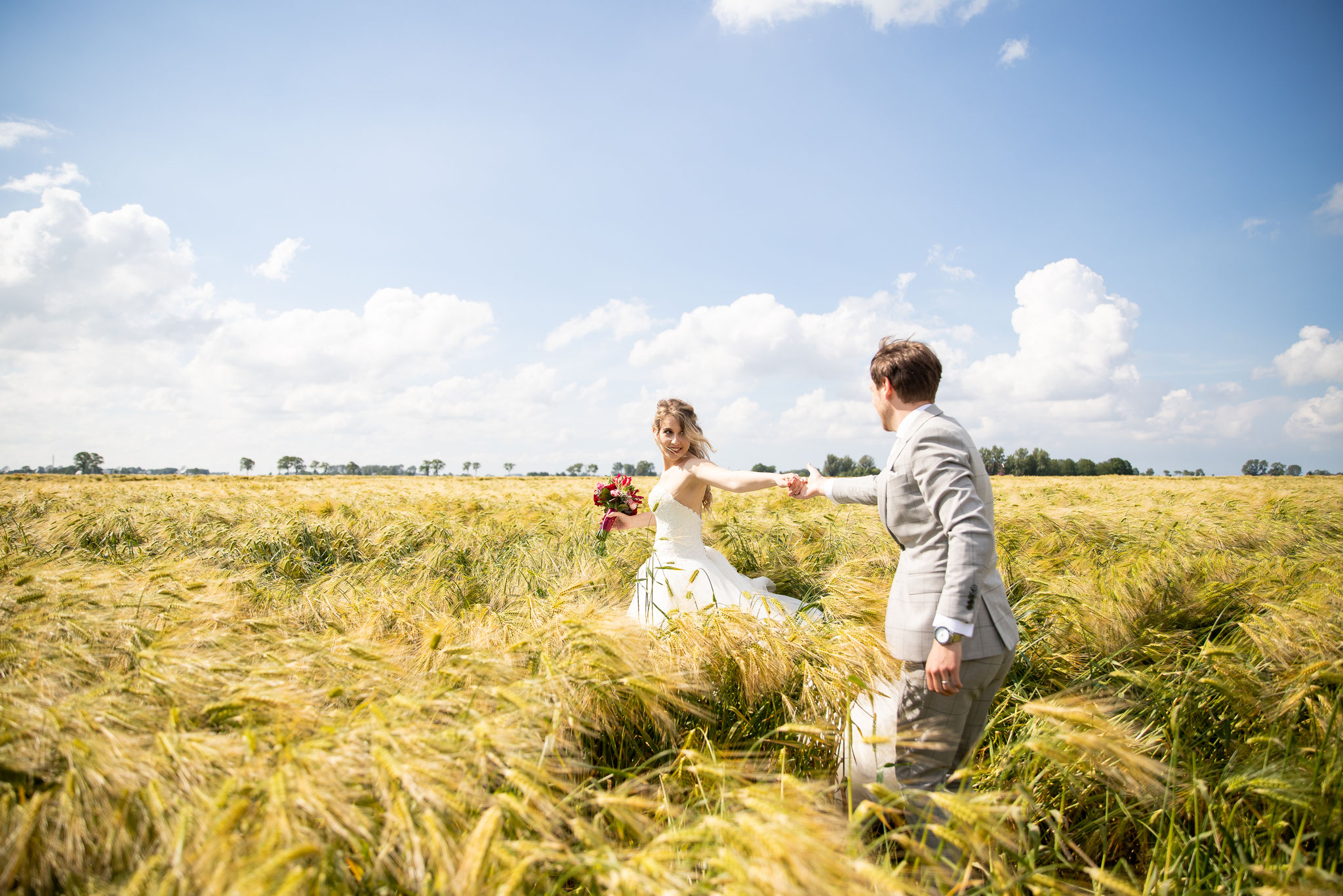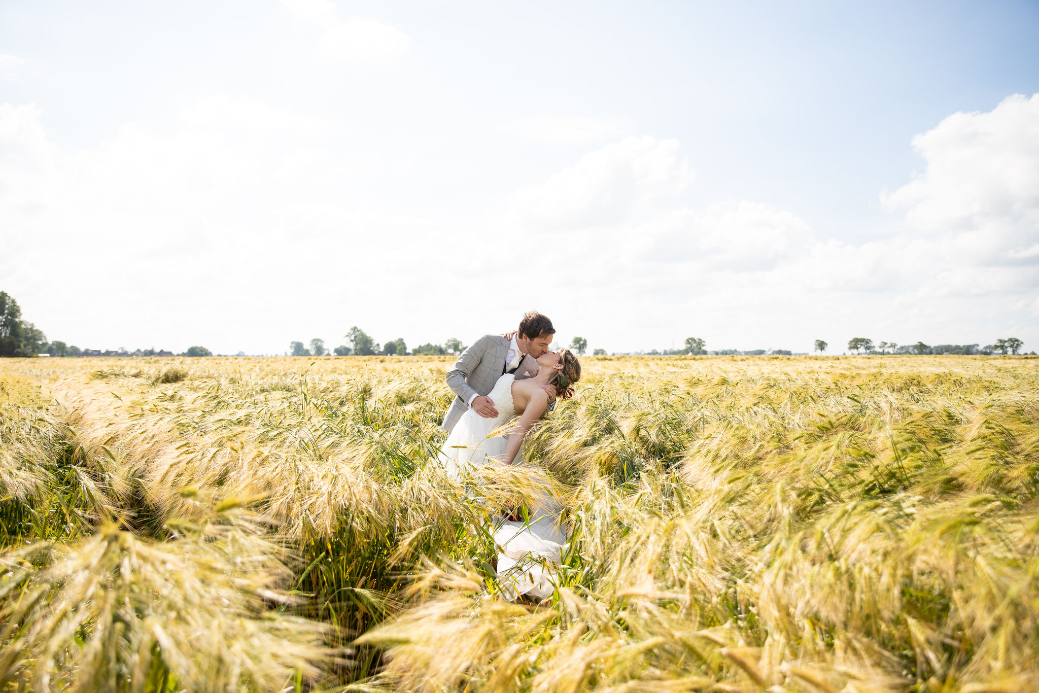 Uitgerekte velden vol graan en een onstuimige lucht dienden als achtergrond voor deze prachtige gestileerde bruiloftsshoot. In de namiddag bewees het zonlicht perfect voor een romantisch plaatje. Het resultaat? Een ontspannen fotoserie met de kracht van de pure natuur en de liefde tussen Robin en Meddy.